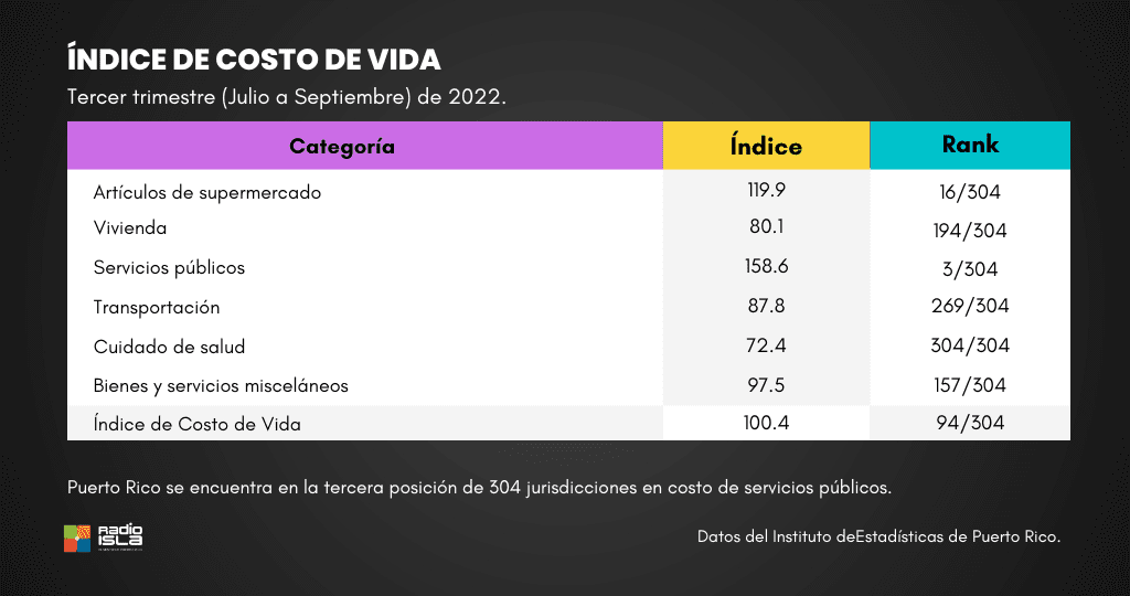 El Instituto de Estadísticas de Puerto Rico (IEPR) presentó el Índice de Costo de Vida de Puerto Rico durante el período de julio a septiembre de 2022. El informe indica que Puerto Rico consta de un índice de costo de vida de 100.4, siendo el país número 94 dentro de 304 jurisdicciones.