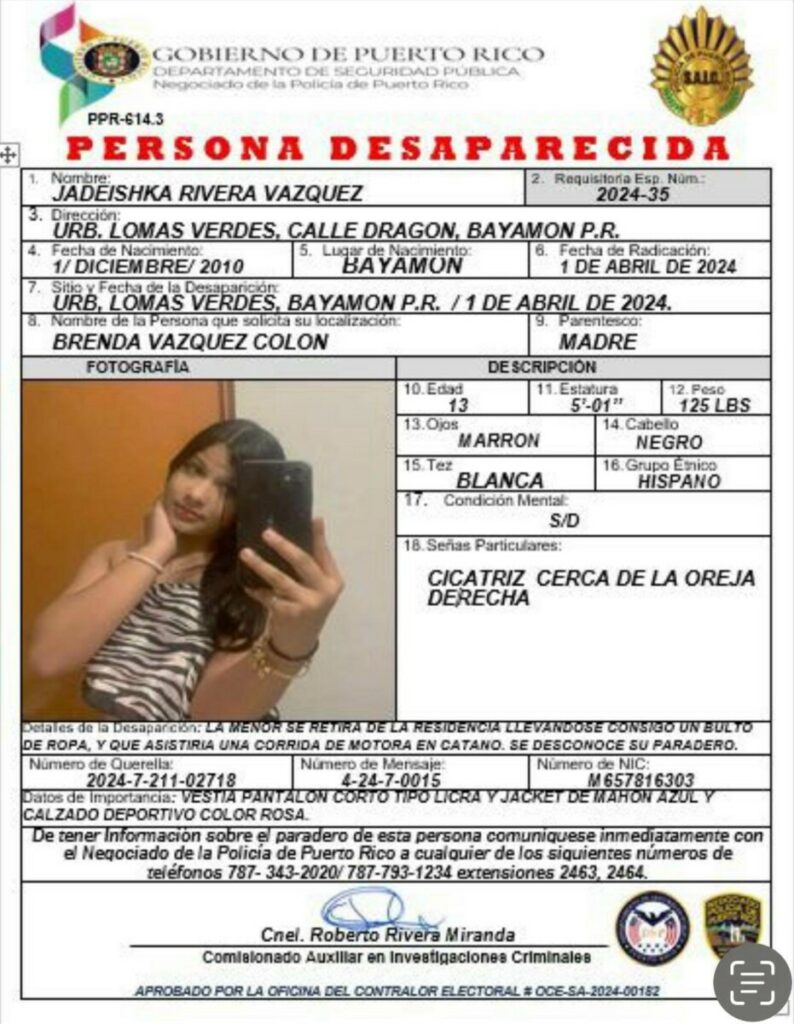 “Agradecemos a todos el personal, voluntarios, vecinos y a la familia de Jadeishka quien, por las pasadas horas, se mantuvieron unidos con el propósito común de encontrar con vida a esta joven”, expresó el jefe de la Policía.