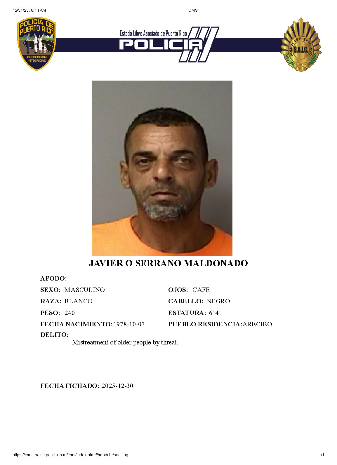 En horas de la tarde del martes, la Policía logró el arresto de Serrano Maldonado mediante los agentes adscritos a la División de Arrestos y Allanamientos del área Arecibo, quienes lo llevaron ante la jueza Alba I. Calderón Cestero del Tribunal de Arecibo. Al no prestar su fianza, fue ingresado en la Institución Correccional de Bayamón.