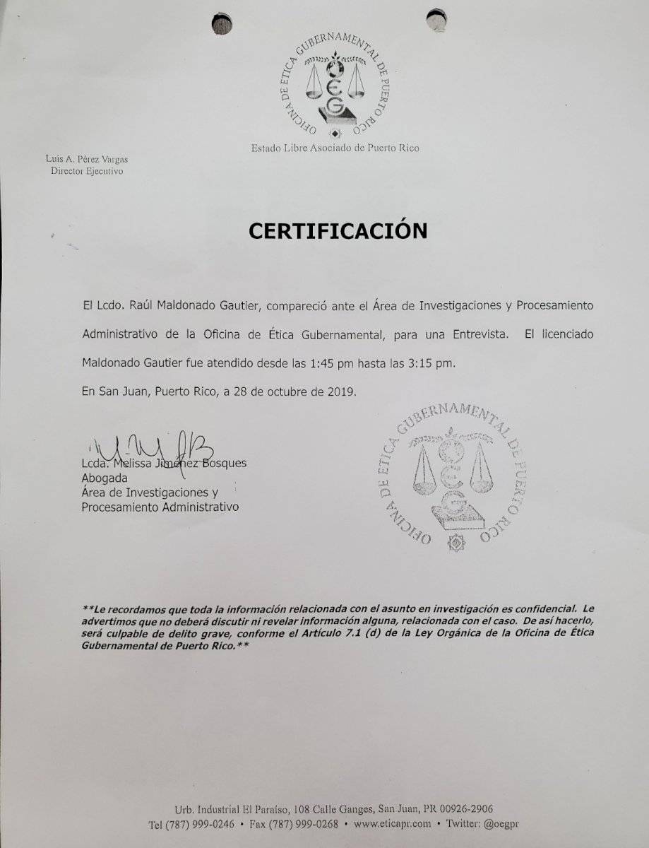 - Las abogadas investigadoras del AIPA se comunicaron telefónicamente con la licenciada López Mulero para auscultar la disponibilidad de su cliente para comparecer a entrevista a la OEG. El jueves, 10 de octubre de 2019, la licenciada se presentó a la Oficina para discutir los temas que se atenderían con su representado en una próxima visita a la OEG. Era interés, y así le manifestaron las abogadas investigadoras, discutir tres asuntos, al presente concluidos en la Oficina: