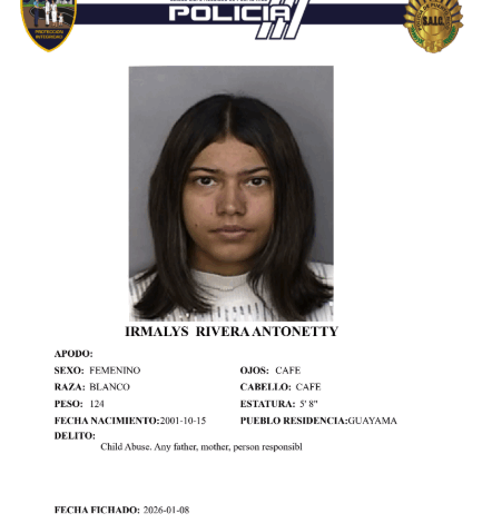 Agentes de la Policía de Puerto Rico, adscritos a la División de Violencia de Género y Asuntos Juveniles del área de Guayama, realizaron una investigación que culminó en la radicación de cargos por parte de fiscalía, por el artículo 53 (Maltrato a Menor) de la Ley 57 para la Prevención del Maltrato, contra Irmalys Rivera Antonetty de 24 años, en el Tribunal de Guayama.