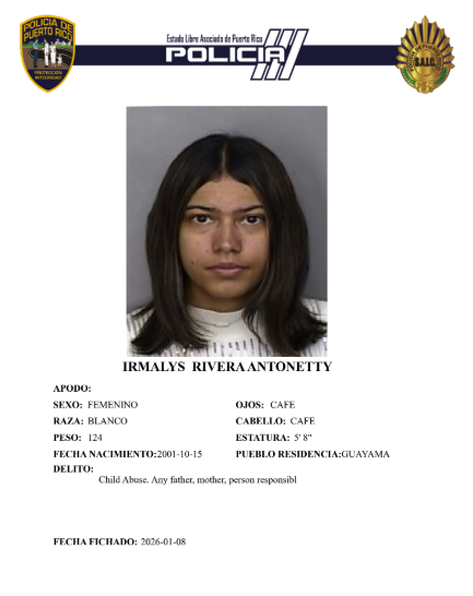 Agentes de la Policía de Puerto Rico, adscritos a la División de Violencia de Género y Asuntos Juveniles del área de Guayama, realizaron una investigación que culminó en la radicación de cargos por parte de fiscalía, por el artículo 53 (Maltrato a Menor) de la Ley 57 para la Prevención del Maltrato, contra Irmalys Rivera Antonetty de 24 años, en el Tribunal de Guayama.