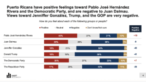 Igualmente, el Partido Demócrata cuenta con un 30 por ciento de aceptación frente al 17 por ciento del Partido Republicano (GOP), a la vez que el excandidato por la Alianza entre el Partido Independentista Puertorriqueño (PIP) y el Movimiento Victoria Ciudadana (MVC), Juan Dalmau Ramírez, tiene un respaldo del 29 por ciento en este renglón.