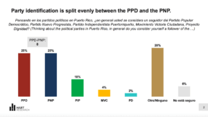 Sin embargo, el licenciado Acevedo Vilá destacó cómo el PNP y el PPD se posicionaron en el mismo nivel con un 25 por ciento, algo que, destacó, es la primera vez que sucede en más de una década de encuestas. Ese no fue el caso del PIP, con un 10 por ciento; ni del MVC, con un 4 por ciento; y tampoco de Proyecto Dignidad (PD), con un 2 por ciento.