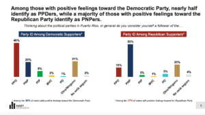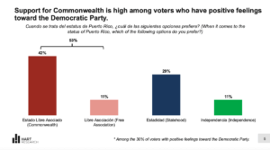 En cuanto al tema de estatus, del 30 por ciento de aquellas personas que se inclinan a apoyar al Partido Demócrata (señalado arriba), el 42 por ciento aseguró preferir el Estado Libre Asociado (ELA) y un 29 por ciento la estadidad, dejando tanto para la libre asociación como para la independencia un 11 por ciento.