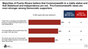 Finalmente, el breve análisis a los que Radio Isla tuvo acceso presentan una serie de aseveraciones que se les realizó a los encuestados, de los cuales el 60 por ciento, que se identifican demócratas, entiende que Estados Unidos no acogerá como estado a Puerto Rico en un futuro cercano, mientras que un 53 por ciento entiende que el ELA debe ser mejorado porque es la única opción real para Puerto Rico.