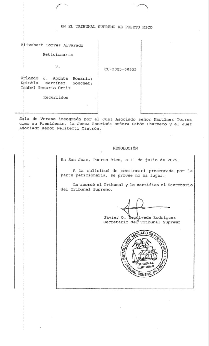 “La jueza del Tribunal de Primera Instancia denegó, nuevamente, la petición de Orden de Protección porque concluye que el testimonio de Elizabeth no es creíble y está plagado de mentiras. Así se demostró durante la vista evidenciaria, que ella continúa acosandome con su carácter mendaz. Solo quiero que ella encuentre paz y la ayuda que necesita”, dijo el exlegislador.