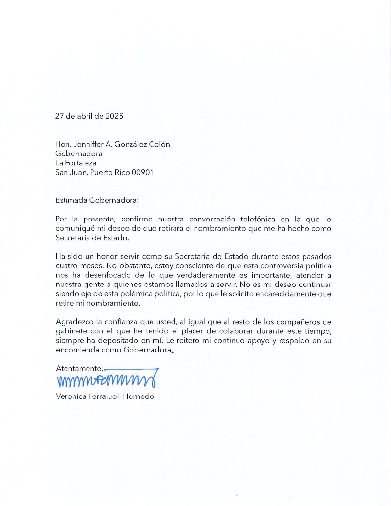 La gobernadora Jenniffer González Colón aceptó ayer, domingo una solicitud de la licenciada Veronica Ferraiuoli para retirar su designación como secretaria de Estado de Puerto Rico.