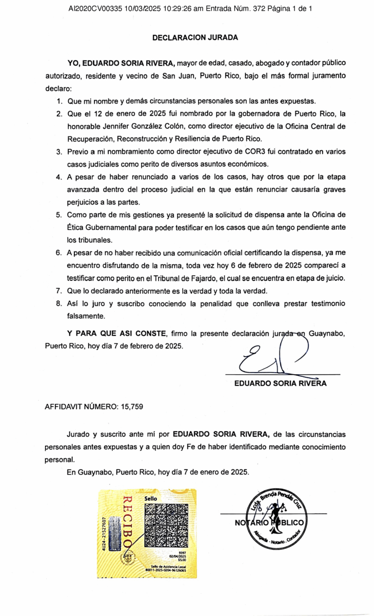 “A pesar de no haber recibido una comunicación oficial certificando la dispensa, ya me encuentro disfrutando de la misma, toda vez hoy 6 de febrero de 2025 comparecí a testificar como perito en el Tribunal de Fajardo, el cual se encuentra en etapa de juicio”, lee el afidávit consignado en el récord de un litigio en el Tribunal de Aibonito.