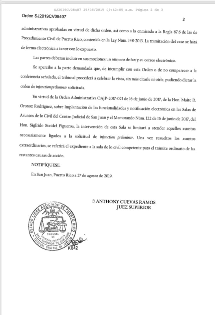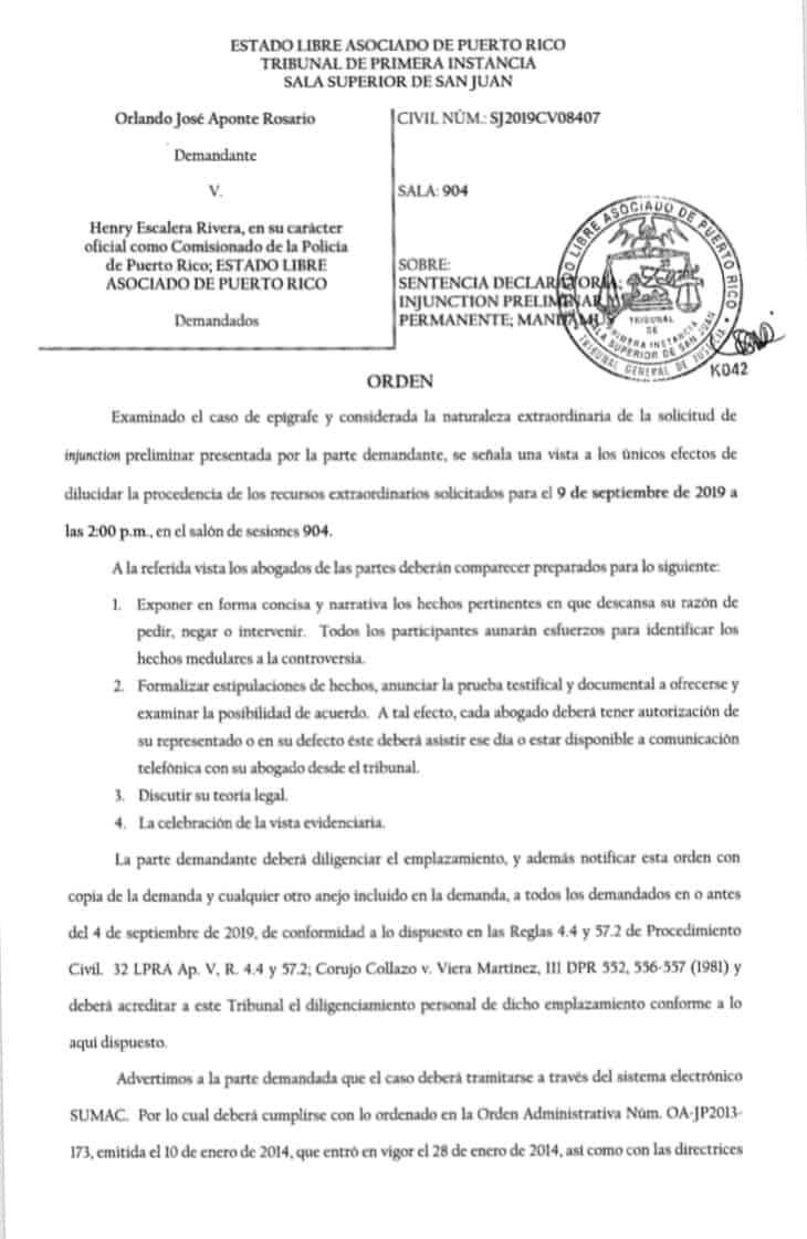 El licenciado Orlando José Aponte Rosario, quien sometió una demanda contra Henry Escalera, en calidad de comisionado del Negociado de la Policía de Puerto Rico asegurando que la asignación de escoltas a Ricardo Rosselló es un acto ilegal, informó que su reclamo será evaluado por el Juez Anthony Cuevas Ramos, quien fijó vista para el martes, 9 de septiembre de 2019 en la Sala Superior de San Juan.