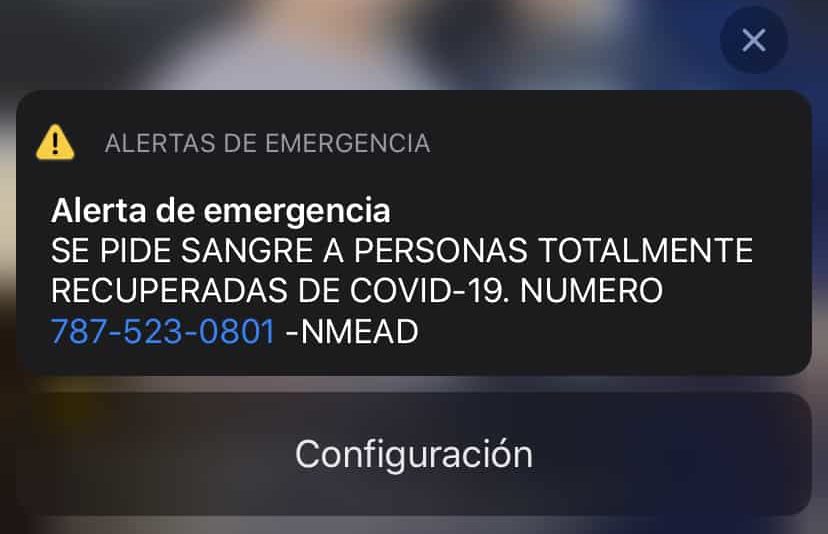 “Se pide sangre a personas totalmente recuperadas del COVID-19. Llame al 787-523-0801”, reza el mensaje.