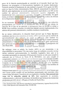 “Como si lo anterior no bastara”, continúa la carta, “nos veríamos forzados a implementar reducciones adicionales que resultarían en un presupuesto base de $11,000 al mes por oficina de mayoría y de $4,000 por oficina de minoría. La reducción de $9,000 mensuales sería el medio menos oneroso de trastocar las operaciones de la Cámara para garantizar las operaciones de la Cámara hasta, al menos,el cierre del presente Año Fiscal, 2022. Estos cambios serían efectivos el 1 de marzo de 2022. De lo contrario, nos veríamos forzados a contemplar otras medidas, incluyendo el cierre parcial de las operaciones, lo cual descontinuaría el ofrecimiento de los servicios legislativos al pueblo puertorriqueño que nos honró con su voto”.