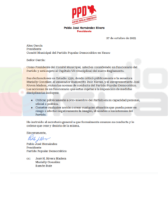 En el comunicado Hernández dictó que el presidente del Comité Municipal del PPD en Yauco violó las normas del partido y adjunto las represalias por sus actos, entre ellos el “cese y desista”.