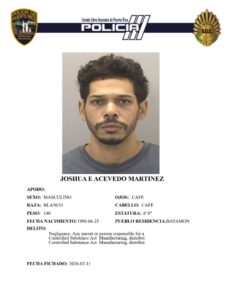 El Departamento de Justicia, a través de la Fiscalía de Bayamón, presentó esta noche 11 cargos contra Joshua Emanuell Acevedo Martínez y Zullymar Nahomi Malavé Rivera por violaciones a la Ley de Sustancias Controladas y a la Ley para la Protección, Seguridad, Bienestar y Preservación de la Unidad Familiar y para la Seguridad, Bienestar y Protección de Menores, informó la secretaria de Justicia, Lourdes L. Gómez Torres.