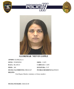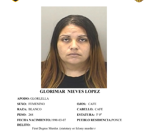 Agentes de la Policía de Puerto Rico, adscritos a la División de Homicidios del CIC de San Juan, realizaron una investigación que culminó en la radicación de cargos, por parte de Fiscalía, por Asesinato en primer grado (art. 93 del CP) a Glorimar Nieves López, de 35 años y vecina de Mayagüez.