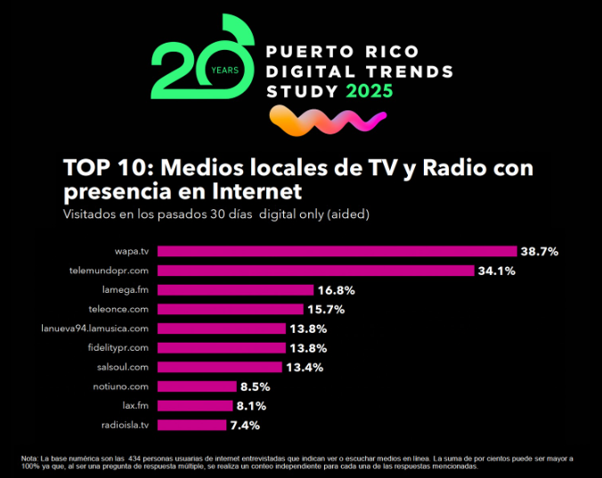 La nueva edición del Puerto Rico Digital Trends Study colocó a Radio Isla 1320 entre los mejores 10 medios locales, tanto a nivel radial como televisivo, con presencia en Internet, según el informe provisto por SME Puerto Rico y Estudios Técnicos en el SME Digital & Innovation Forum 2025.