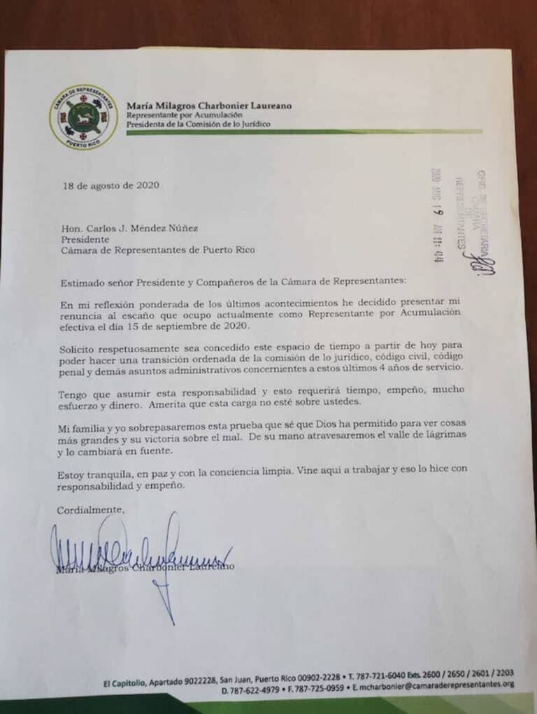 La representante María Milagros “Tata” Charbonier Laureano presentó el martes, su carta de renuncia a su escaño como representante por acumulación efectiva el 15 de septiembre de 2020.
