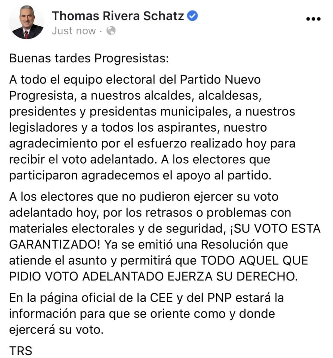 A su vez, el Presidente del Senado de Puerto Rico, Tomás Rivera Schatz emitió unas declaraciones escritas en sus redes sociales, denunciando lo sucedido. Le hizo un llamado a los miembros del partido y les extendió un “agradecimiento por el esfuerzo realizado hoy para recibir el voto adelantado”.
