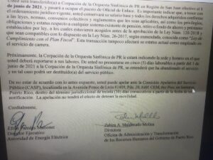 Uno de ellos recibió una carta de traslado a la Orquesta Sinfónica de Puerto Rico donde ocupará el cargo de “Oficial de Enlace” a partir del 1 de junio del 2021.