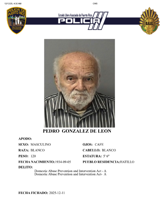Según un informe de la Policía Municipal de Hatillo y el Departamento de Justicia de Puerto Rico, radicó cargos de Ley 54 de Violencia Doméstica a una persona adulta mayor por maltrato mediante amenaza a su pareja.