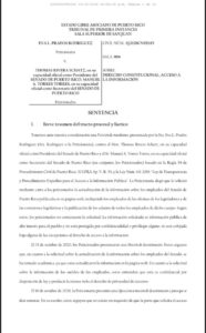 El juez Anthony Cuevas del Tribunal Superior de San Juan ordenó al presidente del Senado, Thomás Rivera Schatz a entregar la información de los salarios de empleados de la Cámara Alta tras la petición de la candidata para la Cámara de Representantes por el Precinto 3 de San Juan por el Movimiento Victoria Ciudadana (MVC), Eva Prados.